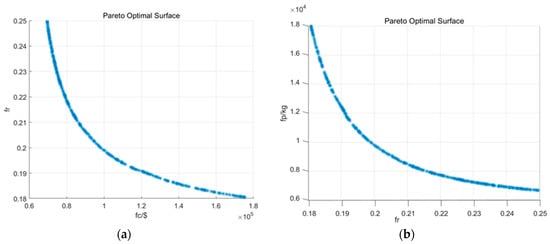 In order to clarify the relationship between the resilience and the other two objectives, the two-dimensional cross-sections of Figure 6 are shown in Figure 8. Both relationships have Pareto fronts, demonstrating the necessity of the application of NSGA-II.