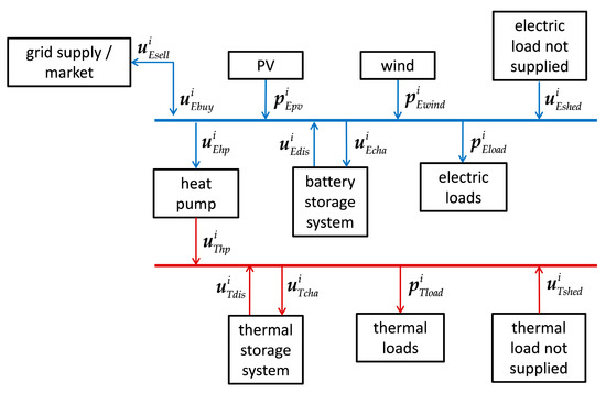 Equations represent the energy balancing equations for each energy carrier at the i-th step. In the case of the system under study, represented in Figure 1, there are two energy vectors (electricity and heat) and therefore the equality equations are 2 × nstep. Each equation formulated for the specific i-th time interval is a function of the sole variables and parameters at this same i-th time interval.