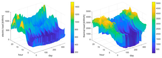 In Figure 2, the annual electric and thermal load profiles are shown in a 3D-plot. The maximum electric demand is about 1220 kW for buildings and 460 kW for transportation, with an overall maximum of 1530 kW (20 January at 19:00) and an overall annual demand of about 4960 MWh. The maximum thermal demand (23 January at 15:00) is 5120 kWt, with an overall annual request of 19,650 MWht. In terms of electric consumption, this thermal request corresponds to annual 6030 MWh, with a maximum of 2870 kW. The overall annual electric energy need, which according to the net zero principle has to be provided by RES production, is about 10,990 MWh.