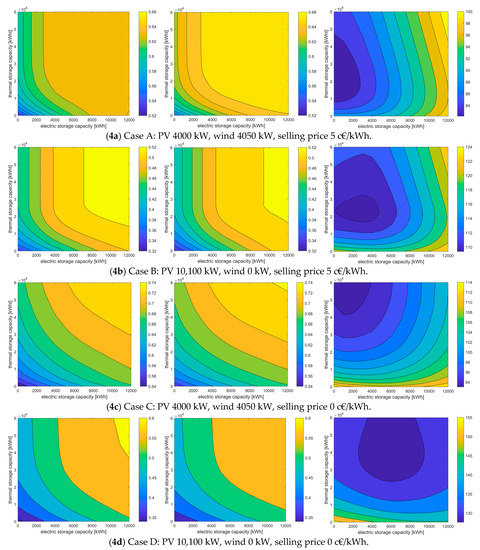 The expected costs are higher in general, due to the necessity of importing more energy. A minimum of 109.4 €/MWh was found in correspondence of a thermal storage capacity of about 24,000 kWht and a 3000 kWh BESS capacity. Self-sufficiency is around 48% (Table 2). As in the previous case, the TESS is more competitive than BESS, however it can be noticed how the contour lines are more stretched in the direction of BESS capacity. This means that, in the presence of higher electric production intermittence, the electrical storage resource is starting to assume a role complementary to the one of the TESS.