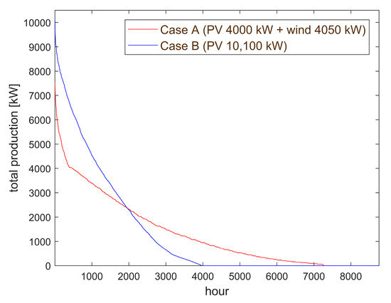 In this second case, the presence of the sole PV generation, with a capacity of about 10,100 kW, was assumed (i.e., no wind turbines are installed). Results are shown in Figure 4b. Due to the presence of a single intermittent source, self-sufficiency cannot reach the same values reached in the previous case. This is clearly due to the fact that PV will only produce in a few hours of the day whereas wind generation is able to produce also in nighttime and on cloudy days. The energy production mix of Case A is therefore characterized by a capacity factor higher than Case B. The production duration curves relative to Case A and B are compared in Figure 5.