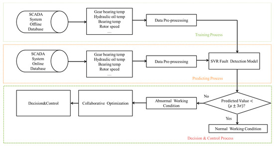 Support vector machines (SVM), known as a kind of learning machine underpinned by the statistical learning theory, were firstly proposed by Vapnik et al. [19]. Support vector regression (SVR) is a machine learning algorithm based on the principle of structural risk minimization is a common application form of SVMs. The SVR is a powerful function approximation technique of outstanding generalization performance, which can be used to obtain globally optimal solutions, as well as map a nonlinear regression problem into a linear regression problem by applying a kernel function. SCADA monitoring provides a series dataset including bearing and lubricant temperatures, rotor speed and active power. Compared to the condition monitoring based on vibration and acoustic signals, SCADA monitoring independent of additional sensors and previous fault datasets. However, raw SCADA data acquired from wind turbines requires precise mathematical modeling. And the mathematical model is sensitive to external disturbance. In addition, accurate modeling requires specification parameters and prior data under abnormal working conditions, which limited the application in diverse gearboxes under variable working conditions. Therefore, an SVR algorithm is developed in the research to explore the ability of self-study and disposal of complex nonlinearity. Moreover, only standardized real-time SCADA data is used in the construction of the SVR model to reduce the impacts of external disturbances. The methodology and framework of this study can be shown in Figure 1.