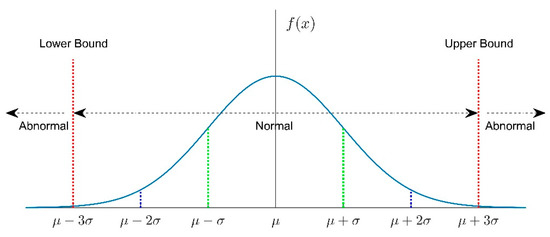 where is the mean or expectation of the distribution, is the standard deviation and is the variance. Different values of and would produce different normal density curves and different normal distributions. The normal density can be specified by means of an equation. The probability distribution of a random variable is identified to be normal if it has a probability density. Figure 2 shows the changes in the normal distribution with the standard deviation. As shown in Figure 2, 68% of the data falls in [] standard deviation of the average, 95% of the data is within [] the standard deviations of the average, while 99.7% of the data falls in [] the standard deviations of the average. If the data is within [], the process will be identified as working in normal. However, once the data goes beyond the control limits [], the process will be considered as out of control, and then faults are detected.