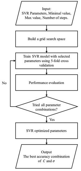 As discussed in the previous section, parameter selection is of great importance in SVR operations. To address this concern, grid search is adopted in the scheme. Regarding the optimizations of the regularization parameter and the size of the error cross-insensitive zone , the grid search was functioned with an exhaustive parameter optimization method. The SVR model will perform optimally only in the case those parameters have been selected properly. The grid search is based on a defined subset of the hyper-parameter space with minimal value, maximal value, and the number of steps input. As shown in Figure 3, the SCADA datasets had been divided into five subsets to perform the fivefold cross-validation [17]. Where, one of these subsets was used for testing, while the others were used in training. Thus, different combinations of parameters C and σ combine the 2-dimensional grid. Only the best combination will be selected for the SVR model training.