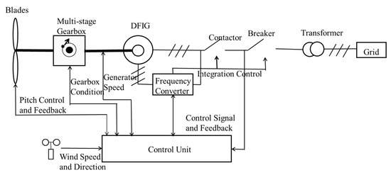 In this section, a one-year SCADA dataset of the WT from a wind farm located in Southern China has been employed for the validation of the proposed methodology. The framework of the studied wind turbine system is shown as Figure 4, which consists of blades, a multi-stage gearbox, a DFIG, and a frequency converter and control unit. The gearbox is driven by blades to spin the generator to electricity production. The stator of the DFIG converts the mechanical energy with high-speed rotation into power output via the gearbox. Wind turbine faults are found mostly from key elements such as the gearbox, blades, and the generator. These faults are usually associated with high maintenance costs and long downtime of turbine systems. Therefore, troubleshooting and efficient fault identification of gearboxes are of great significance to reduce the lifecycle expenditures on wind turbines, as well as to increase productivities of wind farms.
