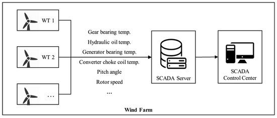 The SCADA system at the wind farm records all wind turbine parameters with a frequency of two seconds. As shown in Figure 5, each record includes a timestamp, output power, stator current and voltage, wind speed, environmental and nacelle temperatures, as well as the generator stator winding and cooling air temperatures [18]. Indeed, there are 34 variables in total including internal parameters such as bearing and lubricant temperatures, as well as external parameters like environmental temperature obtained from the SCADA systems installed at the wind farm. In which the lubricant temperature will be sampled with a resolution of two seconds. These data will be preprocessed through data normalization before analysis. At the same time, the SCADA system keeps a recording of turbine operating and fault information such as startup, shutdown, generator over temperature and pitch system fault. Each fault record is composed of a timestamp, a state number, and the fault information.