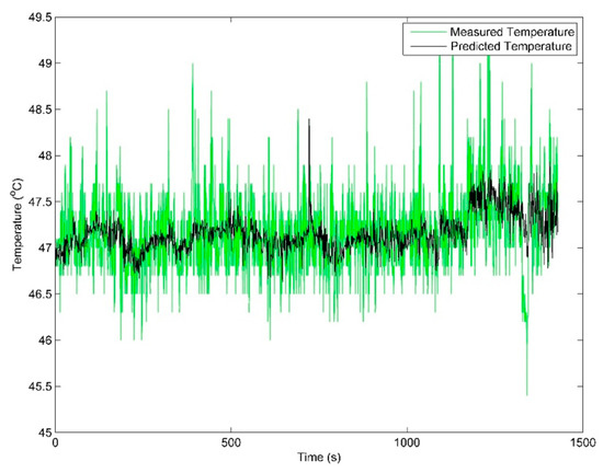 Figure 7 shows the predicted and actual operating temperatures of the gearbox lubricant and bearing. Although there are numerical differences between the measured and estimated values, they present consistency in value changes, or it can be concluded that they are of the same tendency in value variations. Figure 8 is further employed to find errors in the values of residuals. The diagram indicated that the results detected by the SVM model are desirable when the gearbox is working in normal conditions. With the intervals [] and [] are established as warning limit and alarming limit respectively (shown as threshold 1 and threshold 2 respectively in Figure 8, most values fall in within the thresholds, which indicates that the gearbox was working in normal conditions. In this study, mean absolute percentage error (MAPE), root-mean-square error (RMSE), mean absolute error (MAE), mean absolute percentage error (MAPE) are employed to measure the accuracy of the model. RMSE is an estimator that can measure the deviation between the observed value and the real value. While the mean absolute MAE is a measure of the difference between two continuous variables that can be used to reflect the accuracy of the model. MAPE considering both the error between the true value and the predicted value, and the ratio between the error and the true value, thus, it supports a good evaluation of the stability of the model. In Figure 7, the MAPE, RMSE, MAE are 0.4572, 0.3500, and 0.0074, respectively.