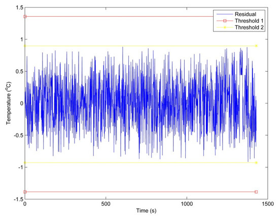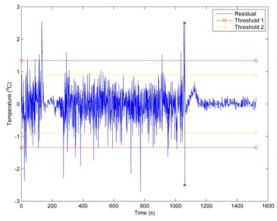 In order to detect the incipient faults of gearboxes, warning and alarming limits need to be set. In the normal working condition, the residual of detected data and the online real-time data fall within the control limits []. However, when the wind turbine suffers from sudden uneven loads, the residual could deviate from the normal working space. The significant changes in the estimated residual could result in a varied distribution of the mean value and standard deviation. As this sudden change would not appear as a trend in time series, thus, once the estimated residual of the data keeping increase and step out of the thresholds, a fault is then identified.