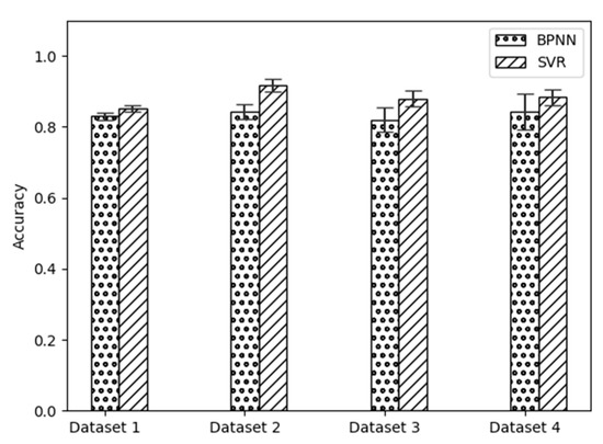 Back Propagation Neural Network (BPNN) is a basic neural network widely used in fault diagnosis, which is generally built as a feed-forward multi-layer network according to the error backpropagation algorithm. To further validate the proposed methodology, a comparative study was also conducted between the methods developed in this research with a BPNN. The results are shown in Table 2 and Figure 11. As shown in Table 2, the average troubleshooting rates achieved by SVR are 0.97%, 7.47%, 3.24%, and 24.26% higher than BPNN in dataset 1 to dataset 4 respectively. While Figure 11 presents the mean and Standard Deviation of the BPNN and SVR fault detection accurracy. It then can be concluded that SVR shows lower variability than BPNN in the experiments conducted.