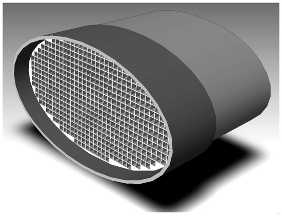 The earliest catalytic reactors for cars were arranged with the classic thin layer spread on inert pellets filling the reactor space. Disadvantages of this approach were recognized quite soon. The first one is the non-negligible proportion of pellets surface in mutual contacts, not accessible for the reactants. Even more important was the second problem: the catalyst layer soon became worn off due to pellet motions caused by vibration of the vehicle. A solution was initially sought in catalyst support made by wounding pre-deformed thin metal sheet strips. Their deformation was shaped to minimise strip contacts and to leave empty space for the flow passages. A typical case is shown, e.g., in Reference [3]. The present-day standard is different: it is a single monolithic ceramic matrix shown in Figure 1, with parallel channels, as foreseen (with different pas-sage geometry) already by Houdry, as seen in Reference [2]. Present-day matrices [4,5,6,7,8] are usually made by extruding a mold of cordierite 2MgO*2Al2O3*5SiO2. After drying and sintering, this material exhibits sufficient mechanical strength and very small thermal expansion. The extrusion die has a large number of fine cores, nowadays it is mostly of a square cross section, see Figure 2 and Figure 3. Each core during the extrusion leaves, in the monolith, Figure 4 and Figure 5, a passage that is now often with its wall thinning at the ends, as shown in Figure 2 and Figure 6 to improve the gas inflow into the passages.