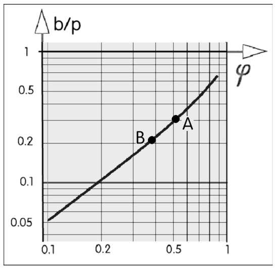 Dependence between the channel area density (defined in Figure 2) and the relative thickness b/p of channel walls. Points A and B represent the matrix samples used in the discussed experiments.