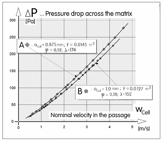 Experimental pressure drop data obtained with the two different matrix samples A and B. They are the same as what is nowadays used in standard car emission control.