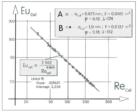 Data from Figure 7 non-dimensionalized—plotted as dependence of Euler number on cell Reynolds number. They could be fitted by the single universal power law line.