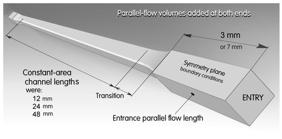 It was, however, decided to stick to three-dimensional reality by not neglecting the existence of the small-radius rounding r = 0.05 mm in the outer corner of the domain. For the effect of this rounding to be felt at all, the circumferential distance between the mesh points on the rounding surface were as small as 0.01 mm. To keep the mesh elements not too elongated (elongation introduces computation errors), the streamwise distance between the mesh points were also to be of the same order of magnitude. For the 152 mm axial length of the channel inside the matrix, this alone would mean the streamwise 15,200 points in which the quantities were to be computed. If there were only 100 data points at each cross section of the domain (which is a small number since it is necessary to have fine mesh at the two side walls of the domain), the number of the data points should be 1.5 million. With such numbers, the computations reaching a reasonable solution convergence lasted agonizingly long. The decision leading to the obtaining of a number of computational results at different flow velocities was to make introductory computation with many shorted passage lengths; at first the length of the constant-cross-section part of the passage was 12 mm. Later, having established the reliability of the data, the computations could be extended to lengths 24 mm, and finally, also again as twice as much at 48 mm. The idea was to use the results for gradually increased lengths as a basis for extrapolations to any channel length.