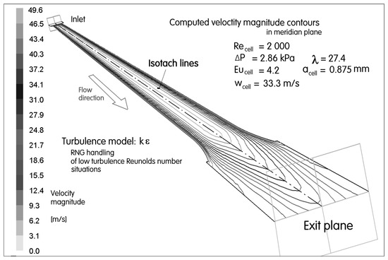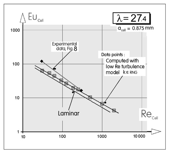 It is obvious from the data values presented in Figure 8 that the cell-size Reynolds numbers in the laboratory measurements were quite low, below ReCell = 300. These are values at which it might be reasonably expected that the flow is of laminar character. The easily varied values of boundary conditions in the computation provided, however, an opportunity to investigate the flow at gradually increased Re and see what happens if the behavior is influenced by turbulence. At any rate, the Reynolds numbers of turbulence at these conditions are, however, quite low. This request modifies the turbulence model. In the previous author’s numerical computations of small-size objects and comparisons with experimental data was found the renormalization group modification satisfaction and is available in the FLUENT package. It was decided to also apply this RNG approach in the present case. The basic turbulence model that was modified was the k–ε two-equation model with standard wall functions. Values of the model constants used in the computations were standard, as delivered by the software supplier. As seen, e.g., in Figure 12, where the computation results are compared with the experimental data from Figure 8, the solutions with the modified turbulence model were extended to the ReCell values as high as ~5000 without any change in the pressure drop character. At lower ReCell values, the computation was also performed—with the same mesh and same other conditions—concurrently with the assumed laminar flow. The computation results presented in Figure 12 were obtained with much shorter passage (for the reasons discussed above in Section 5.2) and hence lower pressure drop. This explains the vertical differences seen between the EuCell values obtained in the experiment and numerical computations. The same comparison is in Figure 13 for the 24 mm long passage of laminar flow computations. Additionally, this passage was much shorter than the one used in the experiment. Of course, the computed EuCell values are therefore lower. Nevertheless, the general character of both approaches may be described as being in agreement. Another comparison diagram of this sort is presented in Figure 14. The data points there were obtained with the modified turbulence model. The only somewhat disappointing aspect of the discussed computation is the behavior of the RNG modification. Ideally, at gradually decreased Re, the results obtained with the modified turbulence model should show a smooth asymptotic approach to the laminar flow results. Diagrams presented in Figures 12–14 do not show such a transition.