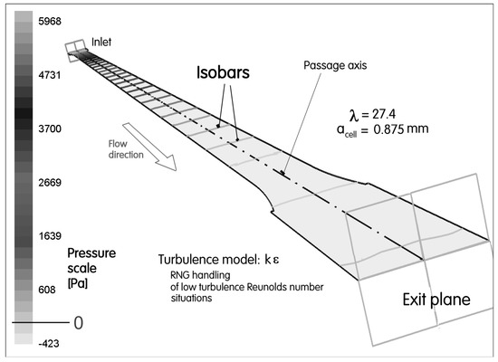 Computed isotachs—lines connected to the locations with the same values of absolute velocity—are presented for passage symmetry plane in Figure 10. The Reynolds number value ReCell = 2000, at which these computations were run, was quite high. This may perhaps be the reason why these isotachs show a distinct boundary layer effect—the velocity gradient concentrating to the vicinity of the passage walls. In the same conditions as in Figure 10 the diagram in following Figure 11 presents computed isobars—the contours of constant pressure on the symmetry plane of the passage. These isobar contours are extremely simple, exhibiting a constant value over the whole cross-section planes. While the used perspective view perhaps does not show it really clearly, an important fact is that the isobars are mutually equidistant—which means the streamwise pressure gradient is constant.