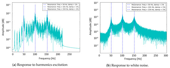 In Figure 3 the two different components of the signal are shown: response to harmonic excitation (Figure 3a, in Equation (12)) and response to white noise (Figure 3b, in Equation (12)). In Figure 4, the global signal is shown.