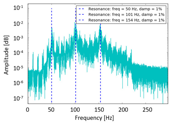 Figure 5 represents the original signal processed with the periodogram algorithm, with the objective of showing the presence of harmonics, and their influence in the spectrum (red lines). The latter is calculated using Equation (13), where is the variation of the frequency in time, O is the order of the machine and the rotational speed. Blue lines in Figure 5 represent the three resonance frequencies.