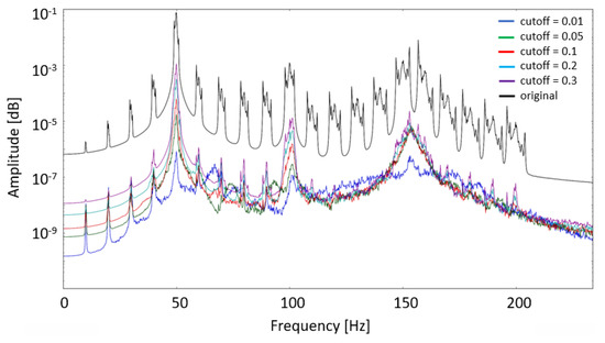 where is the discrete Fourier transform, k is the frequency bin number and N the number of samples. The iterative procedure stops when the amount of energy introduced by the harmonics is 10% of the original value, that is, the energy calculated before applying the cepstrum editing procedure. The choice of this limit value must be defined considering the system under analysis and using a rough prediction on how much the harmonics influence the signal. This procedure presents a disadvantage—if the cutoff quefrency needed to ensure the required energy reduction is too low, it is possible to introduce a distortion in the modal content of the signal. In order to avoid this, the method is coupled with a second algorithm that allows to set a lower bound for the cutoff quefrency value.