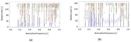 Looking at the stabilization diagram obtained before and after the use of the cepstrum (Figure 8), it can be noticed that there are two harmonics at the normalized values of 0.3 and 0.9. These two harmonics are to be expected based on a priori knowledge of the gearbox characteristics and they are not visible anymore after cepstrum liftering—in Figure 8b the stabilization diagram shows that the energy is more uniformly distributed in the frequency band of interest, without any energy concentration around the two mentioned values (visible in Figure 8a).