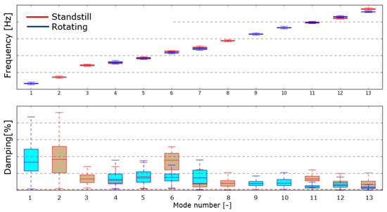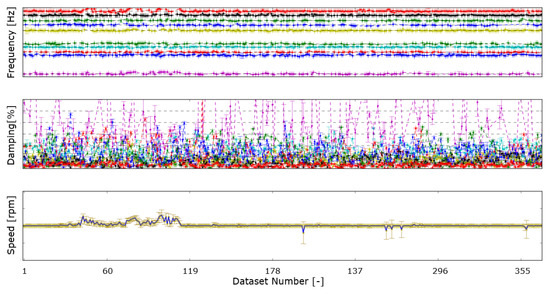 Once the procedure is tested on single data sets, it can be coupled with the automatic tracking algorithm in order to follow the evolution of the estimates along different data sets. Rotor speed has been used as discriminant to automatically choose the data to be included in the correct subset—idling conditions, if the speed is almost zero, and normal operating conditions, if the speed is higher. It needs to be considered that in both the cases the system is in steady state conditions (i.e., speed almost constant). The results are shown in Figure 9 for the subset of idling condition data and in Figure 10 for the subset of normal operating condition data. From the results it can be observed that while frequency values are consistent in the different data sets, damping ratio registers a high variability, confirming that this modal parameter strongly depends on the operating and ambient conditions of the machine.