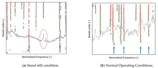 In order to test the performance of the automatic modal parameter estimator and the automatic cepstrum editing procedure on real data, the analysis of two data sets acquired with the turbine respectively in idling condition and running at normal operating conditions is performed and the results are compared. The comparison is made in terms of shape of the stabilization diagram (Figure 8a,b), damping ratio and (normalized) frequency values of the detected modes (Table 5).