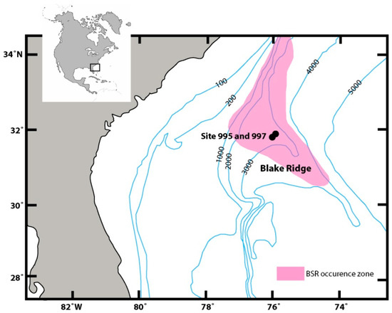 Bathymetric map of the Blake Ridge gas hydrate province including drill Site locations of Ocean Drilling Program (ODP) Leg 164 (modified after Dillon and Paull [39]). Bathymetry contours are presented in meters. The shaded area (in pink) depicts the BSR occurrence.