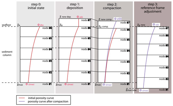 Schematic illustration of the reference frame concept used in the model previously validated by Schmidt et al. [60]. Starting from the left: Step 0 represents the initial state of modeled sedimentary column extending from the seafloor (z0) to the maximum sediment depth (zmax) with an initial porosity curve (red line) ranging from high seafloor porosity value (ɸz(0)) up to low maximum sediment depth value (ɸz(max)) containing an initial number of nodes in the z-direction. In step 1, a new sedimentary layer, represented by the node #7, has been deposited on top of the existing column. The top of the new layer has been marked by the znew dep. symbol and porosity of the new layer remains constant with depth. Step 2 depicts a compaction process of all deposited layers according to their lithological properties (in the drawing assumed to be homogeneous for simplicity) and a new porosity curve (violet line) as a result of this process. Finally, step 3 shows a vertical adjustment of the reference frame to match the upper boundary of sedimentary column with the seafloor coordinates z0 and a new porosity curve (violet line). Note that porosity curves, including initial (seafloor) porosity values, are only symbolic and do not represent the real compaction properties of the Blake Ridge sediments.