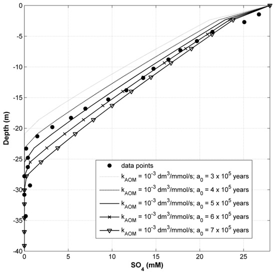 We have investigated the impact of a period of low-productivity, i.e., decreased organic matter formation, that was reported [37] for the last stage of the Blake Ridge basin evolution (from 800 ka on) in modeling Scenario 3 (see Figure 7) and Scenario 5 (see Figure 9). Scenario 3 assumed only in-situ POC decomposition as the main source of methane supply, whereas Scenario 5 simulated a mixed methane source. However, to realistically simulate methane formation dynamics, it is required to correctly evaluate the age of organic matter that could be decomposed. Figure 11 presents sensitivity analysis of the modeling Scenario 2a (variable sedimentation rates and single in-situ methane source) with respect to the initial age of organic matter decomposition entering the methanogenic zone (a0, see Equation (14) and Table 4). The best fit to the observed sulfate concentrations was achieved with the a0 parameter value of 5 × 105 years, which stays in good agreement with previous modeling attempts [26]. Therefore, this value has been used as a constant in all other scenarios. The kinetic control on the methane oxidation process is applied as the kAOM parameter (see Equation (14) and Table 4) with a constant value of 1 cm3∙year−1∙mmol−1 [26] (see Figure 11).