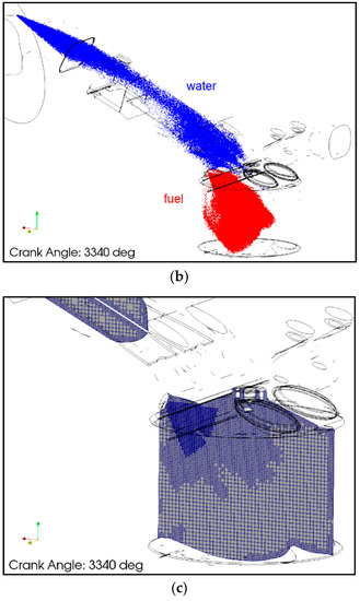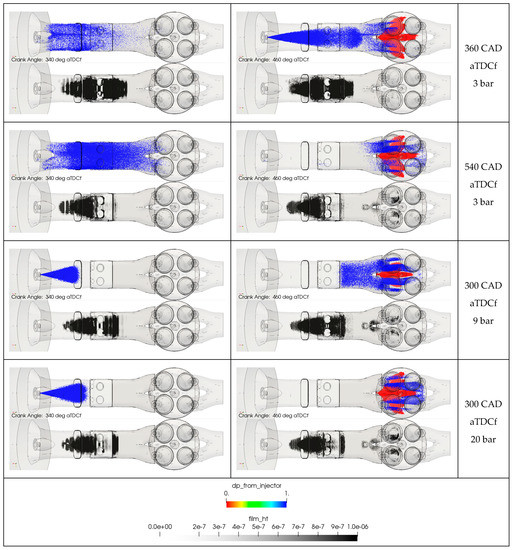 Figure 10 shows detailed visual results of the CFD calculations to better analyze the spray dynamics. Images are taken from the last cycle available, for each case. On the left column, we show the spray situation slightly before the IVO, at 340 CAD aTDCf, to appreciate how water droplets are distributed while approaching the intake phase, as a function of different SOI timings and injection pressures. On the right column, images refer to 460 CAD aTDCf, which is during the intake phase. The relative comparison between images before and during the air intake is believed to give a clear idea of the spray evolution.