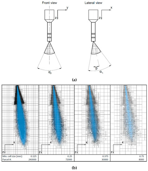 Spray angles definition (a), grid size effects on spray patterns (b) and on tip penetration (c) under conditions specified in Table 3.