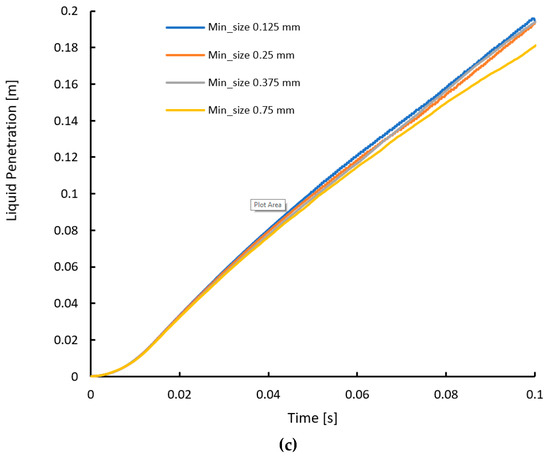 The water injector characteristics are given in Table 3. The injector features a three-hole nozzle, with almost parallel and interacting jets lying on the same plane. All the three holes have been modeled so that the global asymmetric spray morphology is naturally reproduced. Injection rates and a population of atomized droplets based on RR distributions are prescribed as boundary conditions. Three injection pressures have been explored, namely 3, 6, and 9 bar, with an initial Sauter mean droplet diameter (SMD) of 74, 65, 60 μm, respectively. These values have been selected after a preliminary calibration based on the comparison of the simulated spray droplet sizes against measurements. As an example, we show here the validation results for the 6 bar case, as reported in Table 3. In a first step, a simulation campaign has been carried out to assess the effect of the grid size. When refining the grid, a corresponding increase of the number of injected parcels is considered [18]. Results are shown in Figure 2. The minimum mesh size is achieved with four levels of refinements below the base size, by a combination of fixed embedding and adaptive mesh refinement (AMR) techniques. Penetration curves have similar trends, and below 0.75 mm minimum grid size grid independence is achieved. Taking also into account the simulation cost, the minimum grid size of 0.375 mm (base grid size = 6 mm) has been selected for the subsequent engine analyses. The second step has been the validation of the droplet size at downstream locations. Figure 3 shows a comparison of the measured and predicted SMD (D32) and average diameter (D10), at 15 mm from the injector tip (z direction). Simulations are able to reproduce experimental trends and values in a satisfactory manner. Only minor differences can be observed, as the experimental curves show a mild peak in the center that is less evident in the simulations.