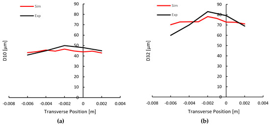 Comparison of simulated and measured droplet diameters at various transverse locations at 15 mm from the tip under conditions specified in Table 3. (a) average diameter (D10); (b) predicted SMD (D32).