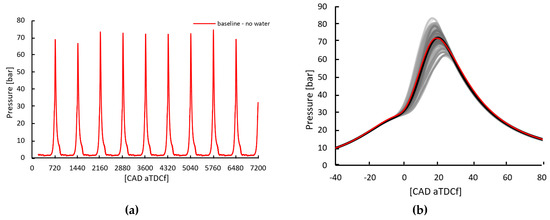 Example of multi-cycle simulations for the baseline configuration without water injection (a), and comparison of measured pressure (average curve in black, 200 cycles in gray) vs. simulated in-cylinder pressure (in red) (b).