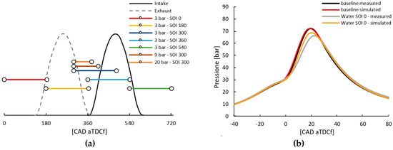 Timing and duration of each water injection case (a), and comparison of measured vs. simulated in-cylinder pressure (b).
