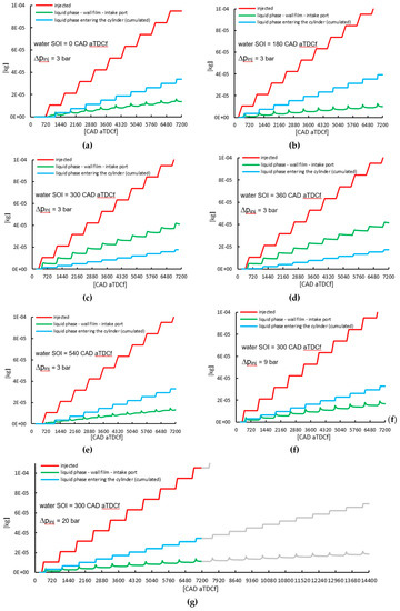 Dynamics of liquid water in the ports and runner, for each simulated case. (a) 3 bar—SOI = 0 CAD aTDCf; (b) 3 bar—SOI = 180 CAD aTDCf; (c) 3 bar—SOI = 300 CAD aTDCf; (d) 3 bar—SOI = 360 CAD aTDCf; (e) 3 bar—SOI = 540 CAD aTDCf; (f) 9 bar—SOI = 300 CAD aTDCf; (g) 20 bar—SOI = 300 CAD aTDCf.