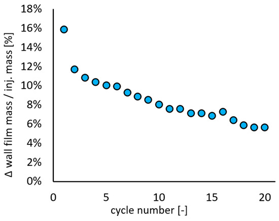 First, we notice that none of the cases under investigation leads to null wall film mass, meaning that the engine operating conditions are not sufficient for vaporizing or stripping off the total amount of water impinging on the walls per cycle. Also, none of the cases have reached a steady state amount of accumulated wall film mass after ten cycles. Therefore, part of the water mass sticks to the walls and will not contribute to the anticipated scopes on the combustion mitigation. From these simulation results it is concluded that, in the engine point under consideration, more than ten cycles are needed to reach fully developed wall films and quasi-steady engine behaviors. From a computational standpoint, this would mean long and costly runs. To better explain this aspect related to the slow dynamics of the water wall film mass in the intake port, we extended one case up to twenty consecutive cycles, specifically the high injection pressure case, at 20 bar. Results are visible in Figure 7g, where the curves use the same colors for the first ten cycles, and then continue in gray until the twentieth cycle. As visible, the wall film mass shows a mild trend towards reaching a plateau, therefore towards a quasi-steady engine operation. For this specific case, the rate of development of the water wall film in the intake port divided by the injected water mass is also plotted in Figure 8. This percentage represents the amount of water that accumulates as wall film with respect to the total injected water mass. The trend is decreasing, as a function of the number of cycles, but still a perfectly steady film mass is not reached. As a consequence, a fraction of the injected water, on the order of 10%, still does not contribute to slowing down the combustion rate.