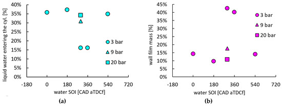 Coming back to the comparisons among different injection timings and pressures, in all the simulated cases shown in Figure 7, the water mass (liquid + vapor) entering the cylinder is slightly lower than the injected mass, because a fraction keeps accumulating in the wall film, decreasing the overall effectiveness and leading to an underestimation of the pressure peak reduction (as previously observed in Figure 6b). It is worth mentioning that this long wall film dynamics is likely due to the quite far installation of the water injector and also to the intermediate engine load point. It is expected that higher load points with higher operating temperatures, or closer injector installations could reduce the time scale of the phenomena and accelerate the combustion response to the actual amount of water injected. To facilitate the quantitative comparison of the results among the different cases, a synthetic report is also provided in Figure 9, which shows the percentages, with respect to the injected mass, of the liquid entering the cylinder and of the liquid accumulated on the wall after 10 cycles.