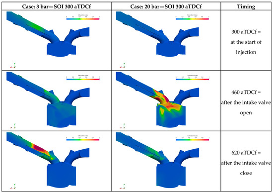 One additional aspect that should be carefully checked is the saturation level of the water vapor phase. Figure 11 shows the comparison of a saturation index between the case at 3 bar—SOI 300 aTDCf and the case at 20 bar—SOI 200 aTDCf, for three different timings. A saturation index value equal to 0 indicates the absence of water vapor phase, while a value equal to 1 indicates that the air is completely saturated with water vapor at the local temperature. Analyzing the first timing (SOI 300 aTDCf, that corresponds to the start of injection), for the low-pressure case, there is a region in the intake port where water vapor is already accumulated from previous cycles, while for the high-pressure case residual water vapor is basically absent. Observing the second timing, during the intake valve open, for the 20 bar case, the contours show that the vapor reaches the cylinder immediately following the liquid parcels (cf. Figure 10), while, for the 3 bar case, the vapor left from the previous cycle is entering the cylinder. Finally, analyzing the third timing, after intake valve closure, for the low-pressure case, we can appreciate how a large amount of vapor remains in the port until the next cycle reaching also saturated conditions, while, for the high-pressure case, the intake port has little amount of water vapor left, not entered in to the cylinder. Saturation is not a limiting factor for the high-injection pressure case, while it appears to be critical for the low injection pressure case.