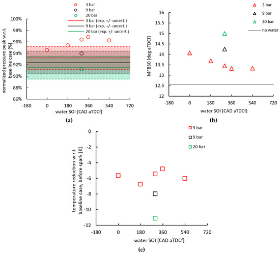 Concerning the effect of the injection timing, at 3 bar we observe that the 300–360 CAD aTDCf cases behave as the worst, as the pressure peak is less reduced and the MFB50 is less retarded, in agreement with the previous conclusions on the spray dynamics (see results in Figure 9). The case at SOI = 0 CAD aTDCf does not strictly follow this criterion though, and despite the trapped water was not the highest, it produces the strongest impact on the combustion. This can be explained including other combined side-effects. In particular, the amount of vapor being formed in the ports decreases the volumetric efficiency and alters the average equivalence ratio. In this case, being Φ = 1 in the baseline case, in the water cases the mixture tends to be slightly rich (injected fuel is kept constant) because of lack of oxygen replaced by vaporized water. This is more pronounced at 0 CAD aTDCf SOI and it explains the reduction of the combustion rate. In addition, as visible in Figure 12c, the effect of charge cooling for this case is not the largest at 3 bar, so the peak reduction is a result of a slight decrease of combustion efficiency, as the air-fuel ratio variations are not compensated in the models.
