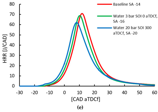With this in mind, the HRR curve in Figure 13b shows that for the high-pressure case (20 bar, SOI = 300 CAD aTDCf), which was more effective on slowing down combustion (see previous Section), a sensible autoignition starts to take place at −28 CAD aTDCf, compared to the baseline case (Figure 13a) in which a sensible autoignition start to take place at –20 CAD aTDCf. Observing Figure 13c and considering that the MAPO knee is located at about –22 CAD aTDCf for the baseline no-water case, we conclude from the MAPO curves that about 2 CAD of spark advance are gained, in this engine point, using the low-pressure water injection (with SOI = 0 CAD aTDCf which is the most effective case), and about 6 CAD of spark advance are gained using the high-pressure water injection. The values found here are in very good agreement with engine measurements already reported in [9], for the same engine point. The benefits of a KLSA shift are shown in Figure 13d–e, comparing in-cylinder pressure and HRR curves. The IMEP is 1.8% higher for the low-pressure case, while for the high-pressure case the IMEP is 4.2% higher, therefore this improvement also translates to the overall thermal efficiency.