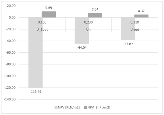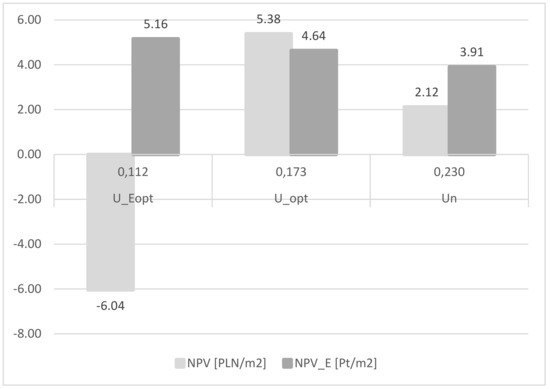 Figure 2 shows the results for the ceramic hollow blocks (CHB)-CGB-MW variant (Uo = 1.154 W/(m2K)) and climate zone III. It should be noted that in this variant NPV > 0 was obtained for U = UEopt. Both the difference (in percent) between NPVE (Uopt) and NPVE (UEopt) as well as between NPV (Uopt) and NPV (UEopt) is not great.