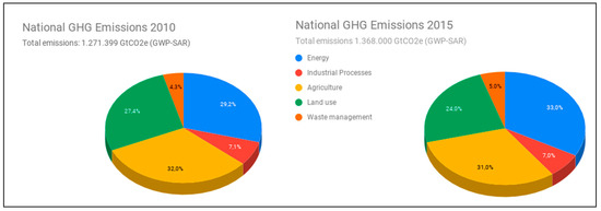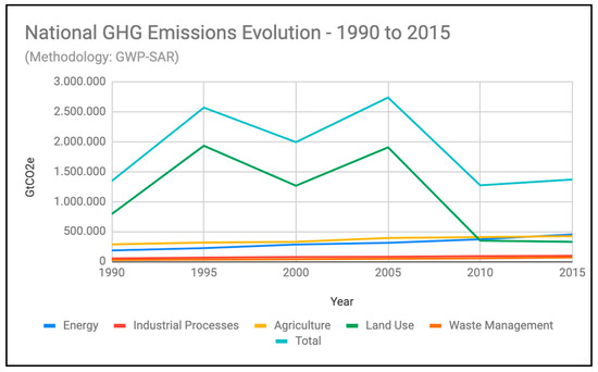 The Brazilian government, through the Ministry of Communications, Technology, Innovation, and Science (MCTIC) has been inventorying national GHG emissions since 1991. The 3rd National Inventory, published in 2016, with data up to 2010, indicates that the economic sectors responsible for the majority of the national emissions are “Agriculture”, with 33% and “Energy”, with 29%—e.g., Brazil is world’s biggest ethanol producer [39]—followed closely by “Land Use and Forests”, with 27% of the total emissions. “Industrial Processes” and “Waste Treatment” respectively account for 7% and 4% of the national emissions (Figure 1). The estimated total emissions for 2010, calculated by the IPCC 2006 methodology (GWP-SAR), was 1,364,197 GtCO2e [40].