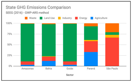 According to the SEEG GHG inventories (Amazonas and Goiás did not issue official GHG inventories. To fill in this gap, this study has used the SEEG platform emissions estimates, issued by the Climate Observatory according to the IPCC guidelines [46]), the states that are closest to the national emissions framework are Paraná and Goiás. In both, the “Agriculture” sector is responsible for most of the emissions (33% in Paraná and 54% in Goiás), followed by the “Land Use” sector (32% in Paraná and 28% in Goiás). The “Industry” sector has practically no contribution to emissions in Goiás, while in Paraná it accounts for 3% of emissions. Coherently, the “Energy” sector accounts for 25% in Paraná, while in Goiás it corresponds to 13% of the emissions.