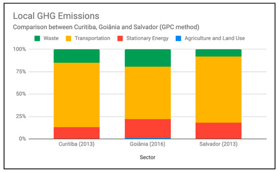 Considering the three cities that used the GPC method, the sector that occupies the first place in all three inventories is the “Transportation” sector: 78% of emissions in Salvador, 73% in Curitiba and 58.47% in Goiânia. In Salvador and Goiânia, the second place in emissions is occupied by the “Stationary Energy” sector, with 20.58% in Goiânia and 18% in Salvador. In Curitiba, the “Stationary Energy” sector occupies the third place, with 12%, just behind the “Waste” sector, with 15% of total emissions. In Salvador and Goiânia, the “Waste” sector also has critical participation, occupying the third place, respectively with 8% and 9.55% of the emissions. Among the three cities, only the city of Goiânia recorded some contribution to the “Agriculture and Land Use” sector, with 1.4% of total emissions (Figure 5).