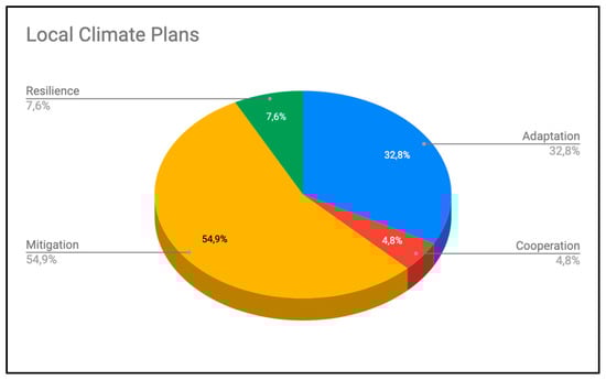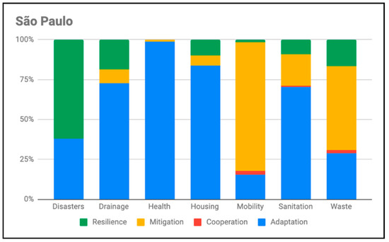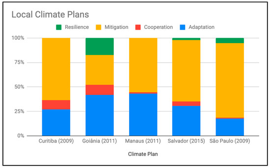 This finding is consistent with the fact that combating air pollution, mainly particulate matter produced by motor vehicles, is a critical challenge for the city of São Paulo [58]. According to Saldiva [59], the reduction of air pollution in the city of São Paulo to the levels recommended by the World Health Organization (WHO) could bring about an increase in the life expectancy of the population of about three years. Thus, alternatives to fossil fuels in urban mobility is a crucial issue in São Paulo’s climate strategy. Besides, in these four investigated cities adaptation was the second most mentioned climate action axis. Goiânia’s Climate Plan presented a higher number of references to Resilience in comparison to the other cities’ Climate Plans. In all cities, the cooperation axis was the least mentioned. Considering the total number of references observed in the five Climate Plans, Mitigation obtained 54% of the references, Adaptation, 32.8%, followed by references to Resilience, with 7.6%, and Cooperation, with only 4.8% (Figure 7).