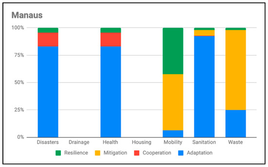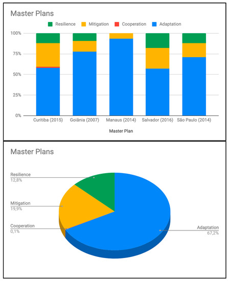 All of the investigated Master Plans contain references to Adaptation, Mitigation, and Resilience actions, except for Manaus, which did not show results for Resilience actions. Furthermore, only Curitiba’s Master Plan has presented one reference to decentralized cooperation actions. All five Master Plans have shown a higher number of references to Adaptation actions, in the first place, and to Mitigation actions, in the second place. Taking the sum of all the Master Plans’ references to climate action, the most mentioned axis was Adaptation, with 67.2%% of the references, followed by Mitigation, with 19.9%, Resilience, with 12.8% and Cooperation, with 0.1% (Figure 8).