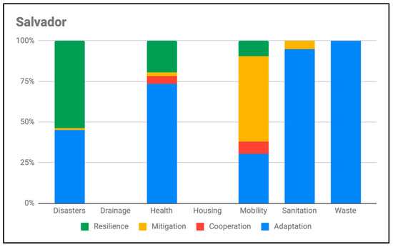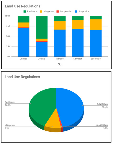 In Manaus, Salvador and São Paulo, the most referenced climate action axis was, firstly, Adaptation, followed by Mitigation and Resilience. The cities of Goiânia and Curitiba were the only ones to present references to decentralized cooperation actions in their land use regulations. In the city of Goiânia, the most mentioned axis was Resilience, followed by Adaptation and Mitigation. In the city of Curitiba, the most mentioned axis was Adaptation, followed by Resilience and Mitigation (Figure 9). Considering the overall sum of references, the Adaptation axis was the most mentioned, with 46.2%, followed by Resilience, with 42.9%, Mitigation, with 9.9% and Cooperation with only 1.1% (Figure 9).