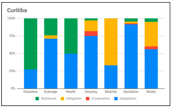 Starting in 2009, when the National Climate Change Policy (PNMC) was published, all investigated cities, except for Manaus, have issued their own climate plans. The cities of Curitiba and São Paulo edited their climate plans in the same year of 2009, contemplating Mitigation, Adaptation, and Resilience actions. Goiânia, in turn, edited its Sustainable Goiânia Plan in 2011, within the framework of the Inter-American Development Bank’s Emerging and Sustainable Cities Platform (IDB). Goiânia’s Plan is broader than a strict climate plan but contemplates in-depth climate actions. The city of Salvador, in a similar way, incorporated climate actions into two regulations issued in 2015, one approving the Municipal Program for Sustainable Development and Incentives for Innovation and another approving the Environmental and Sustainable Development Policy of the Municipality. For the city of Manaus, its 2011 Environmental Code has been used in this study as a proxy of "climate plan," since it also contemplates, indirectly, some local climate actions. Table 6 and Figure 6 present the qualitative analysis results of climate plans.