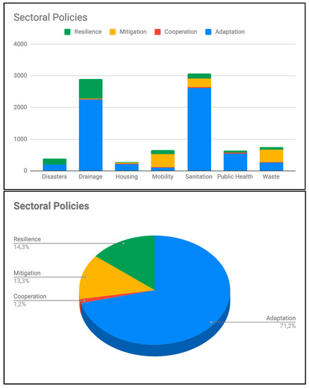 According to national regulations, the edition of local plans on Sanitation, Waste Management, and Urban Mobility is mandatory to Municipalities [61,62,63]. Drainage plans are not mandatory; however, due to extreme weather events, an increasing number of cities have recently issued, if not proper plans, at least specific regulations on urban drainage and rainwater management. Concerning housing, even though local Housing Plans are as well not mandatory, in order to access National Social Housing Fund resources municipalities must edit Social Housing Plans, focused on housing provision for low-income families [64].